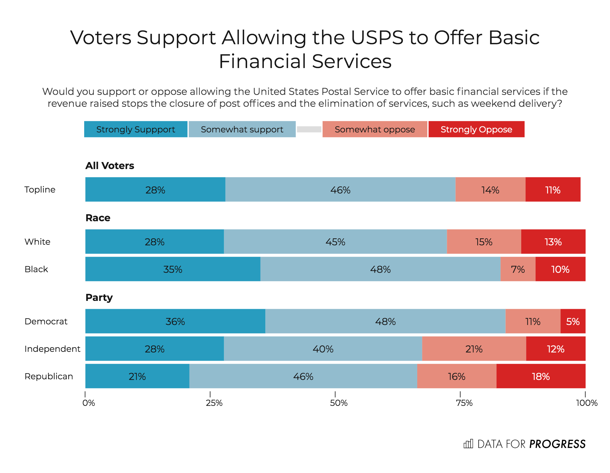 Even in this time of highly polarized politics, this is a proposal that has overwhelming support from Americans of all political leanings. Data for Progress found that 84 percent of Democrats and 67 percent of Republicans support postal banking.
