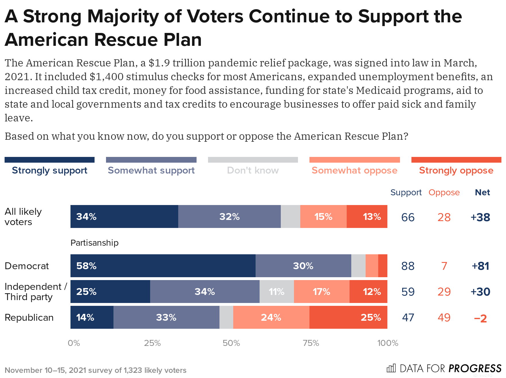 As President Biden pushes forward with his Build Back Better Act, new Data for Progress polling finds that voters strongly support the first stimulus package passed by the Biden administration in March: the American Rescue Plan. In a new survey conducted from November 10 to 15, we find a +38-point margin of voters support the American Rescue Plan, including an overwhelming majority of Democrats (+81) and a clear majority of Independents (+30). Republican voters are split on the bill, with 47 percent in support and 49 percent opposed.