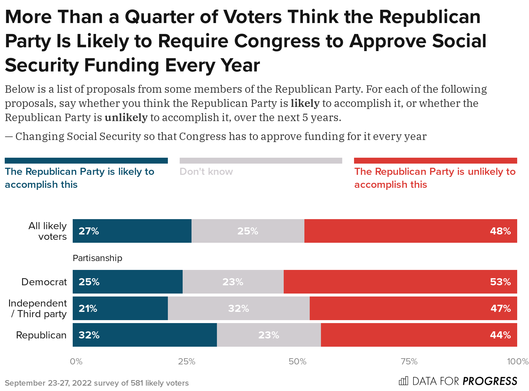 Voters also don’t have confidence that Republicans will be able to accomplish their plan to change Social Security. Forty-eight percent of voters, including 53 percent of Democrats and and 47 percent of Independents, believe that the Republican Party is unlikely to require Congress to approve Social Security funding each year. Forty-four percent of Republicans don’t have faith in their own party to change Social Security, saying it’s unlikely that the GOP will be able to carry out its plan.