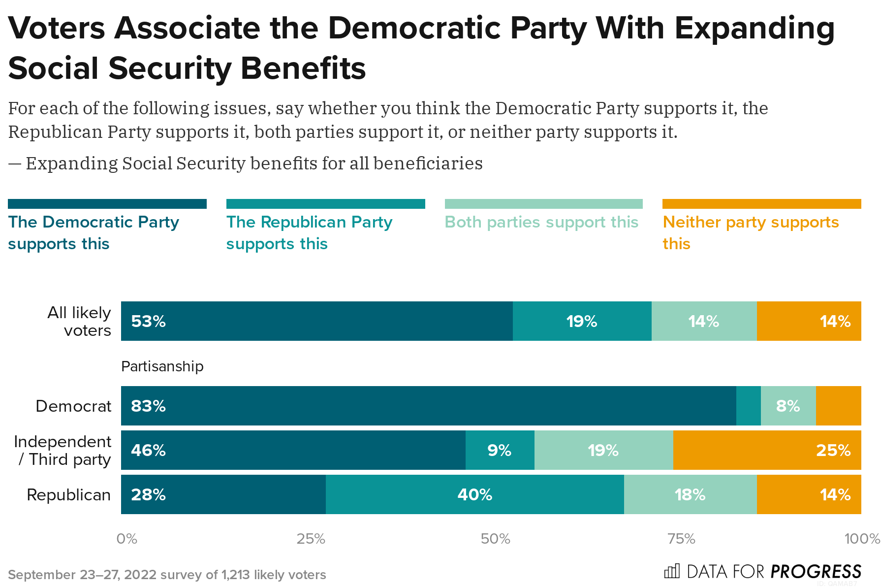 Clearly, Social Security is supported across the board, regardless of political affiliation. In fact, voters deeply understand its essential role in society and are willing to pay for it rather than see it end. Data for Progress finds 76 percent of voters, including 83 percent of Democrats, 72 percent of Republicans, and 70 percent of Independents, would rather pay a little more into Social Security to ensure it remains fully funded.