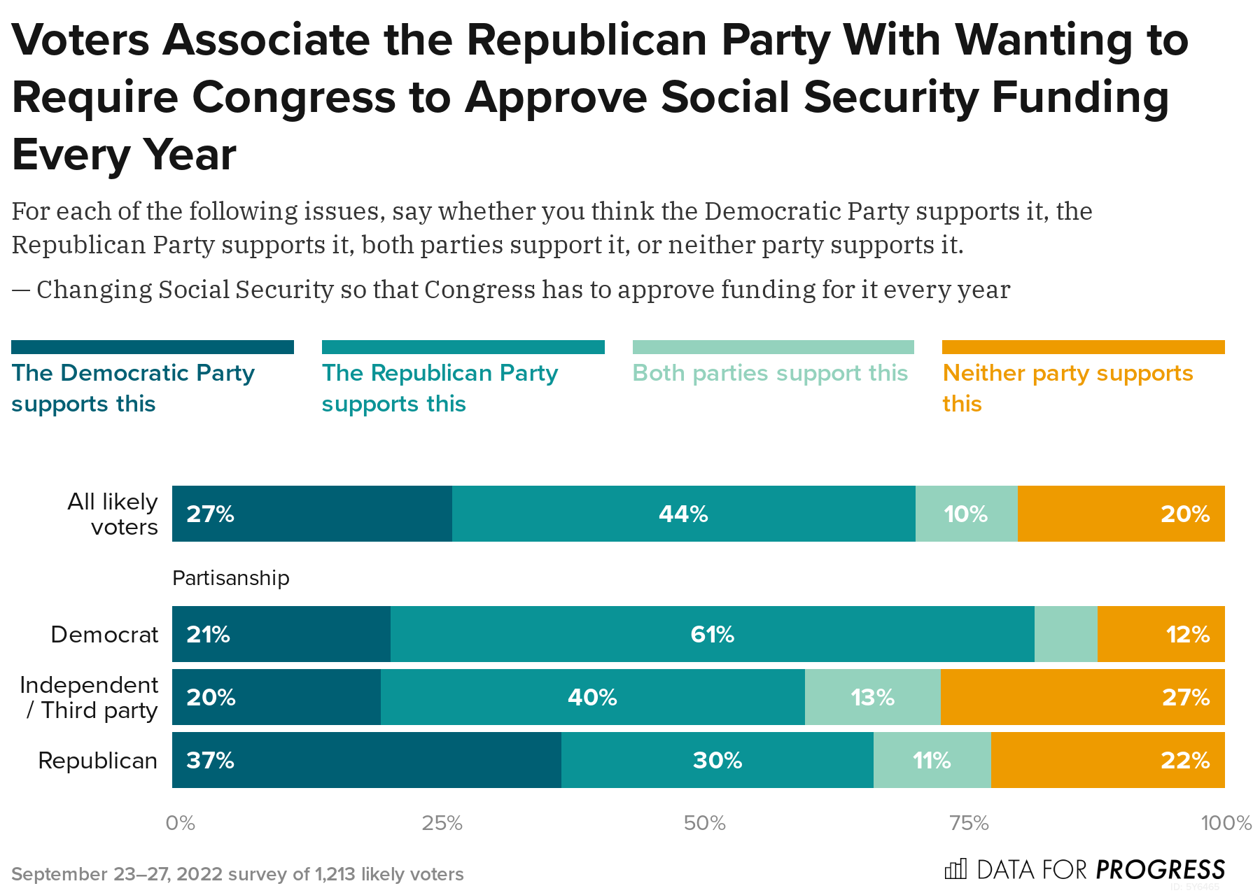 From a messaging stance, voters generally associate the Democratic Party with expanding Social Security benefits and the Republican Party with changing Social Security. Only 27 percent of voters associate the Democratic Party with changing Social Security so Congress has to approve funding for it each year, but 44 percent of voters associate the Republican Party with this proposal. Twenty percent of voters associate neither party with the change.