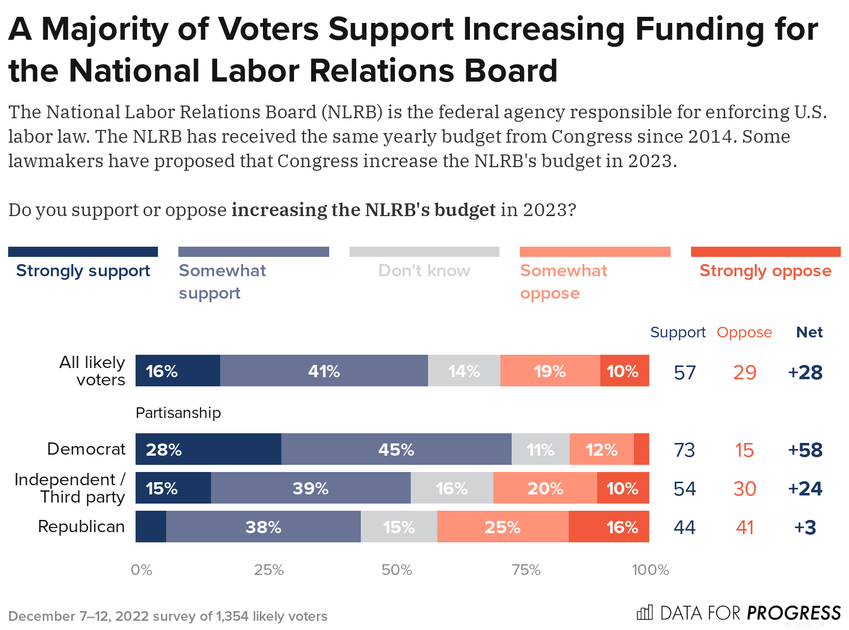 A new national survey by Data for Progress of 1,354 voters finds broad support for increasing the NLRB’s budget in the next fiscal year. While an additional $25 million appropriation included in the omnibus budget bill released this week is less than what the board’s leaders, allies in Congress, and the labor movement had called for, these additional resources will nevertheless be vital to preventing staff furloughs and ensuring continued capacity to efficiently process new union representation petitions and adjudicate charges of unfair labor practices.