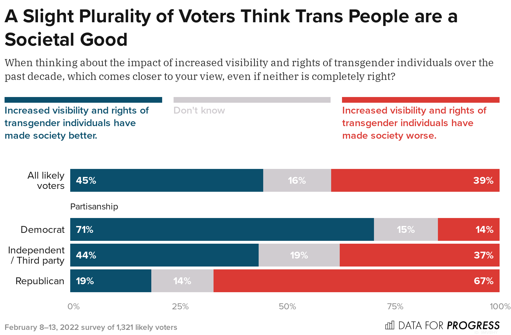45% of likely voters say that the increased visibility and rights of transgender individuals have made society better, compared with 42% who say it has made society worse. The partisan split on this question is vast, with 71% of Democrats saying that the increased visibility and rights of transgender individuals have made society better. Only 44% of Independents and 19% of Republicans share this view.