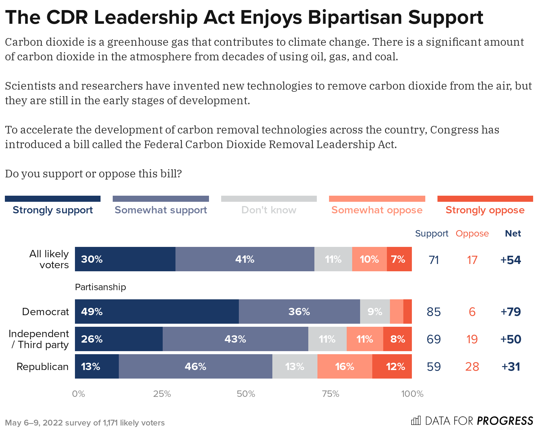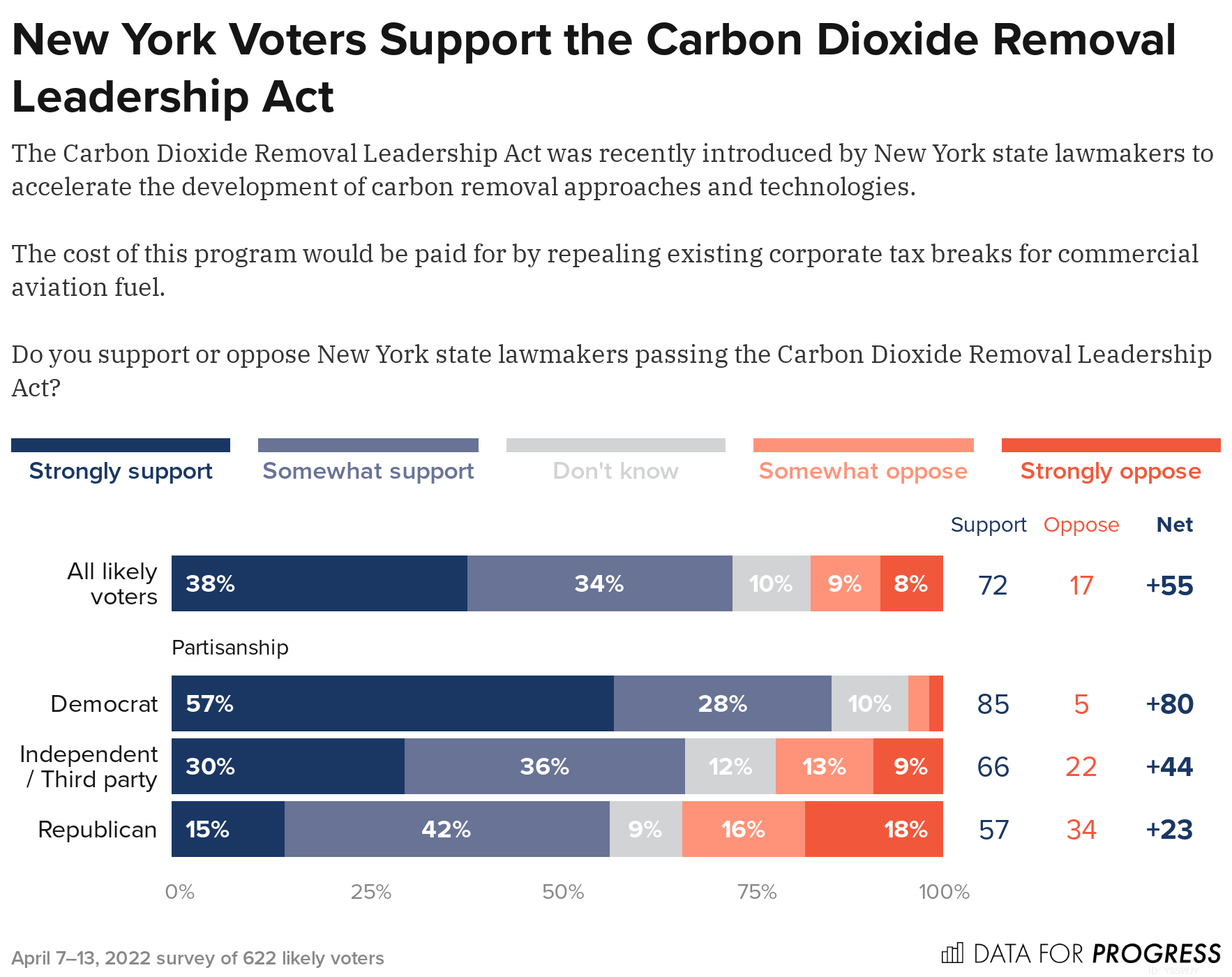 And the New York CDRLA is popular, too: recent Data for Progress polling in New York state finds that 72 percent of voters approve of the state legislature passing a bill to accelerate the development of carbon removal approaches and technologies. This includes 85 percent of Democrats, 66 percent of Independents, and 57 percent of Republicans.