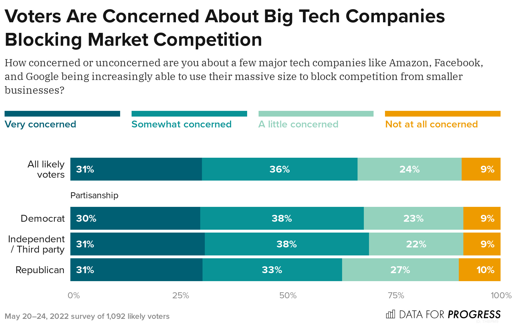 New Data for Progress polling reveals that 67 percent of voters are very or somewhat concerned about major tech companies like Amazon, Facebook, and Google wielding their monopoly power to block competition from smaller businesses.