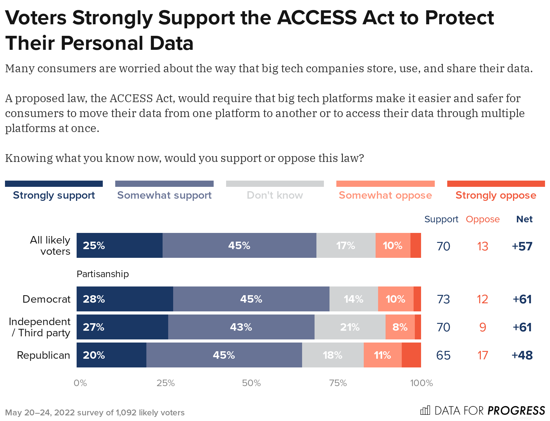We find that voters support the ACCESS Act by a +57-point margin (70 percent support, 13 percent oppose). This polling also reflects strong bipartisan support: Independent voters support the legislation by a +61-point margin (70 percent support) and Republicans by a +48-point margin (65 percent support).
