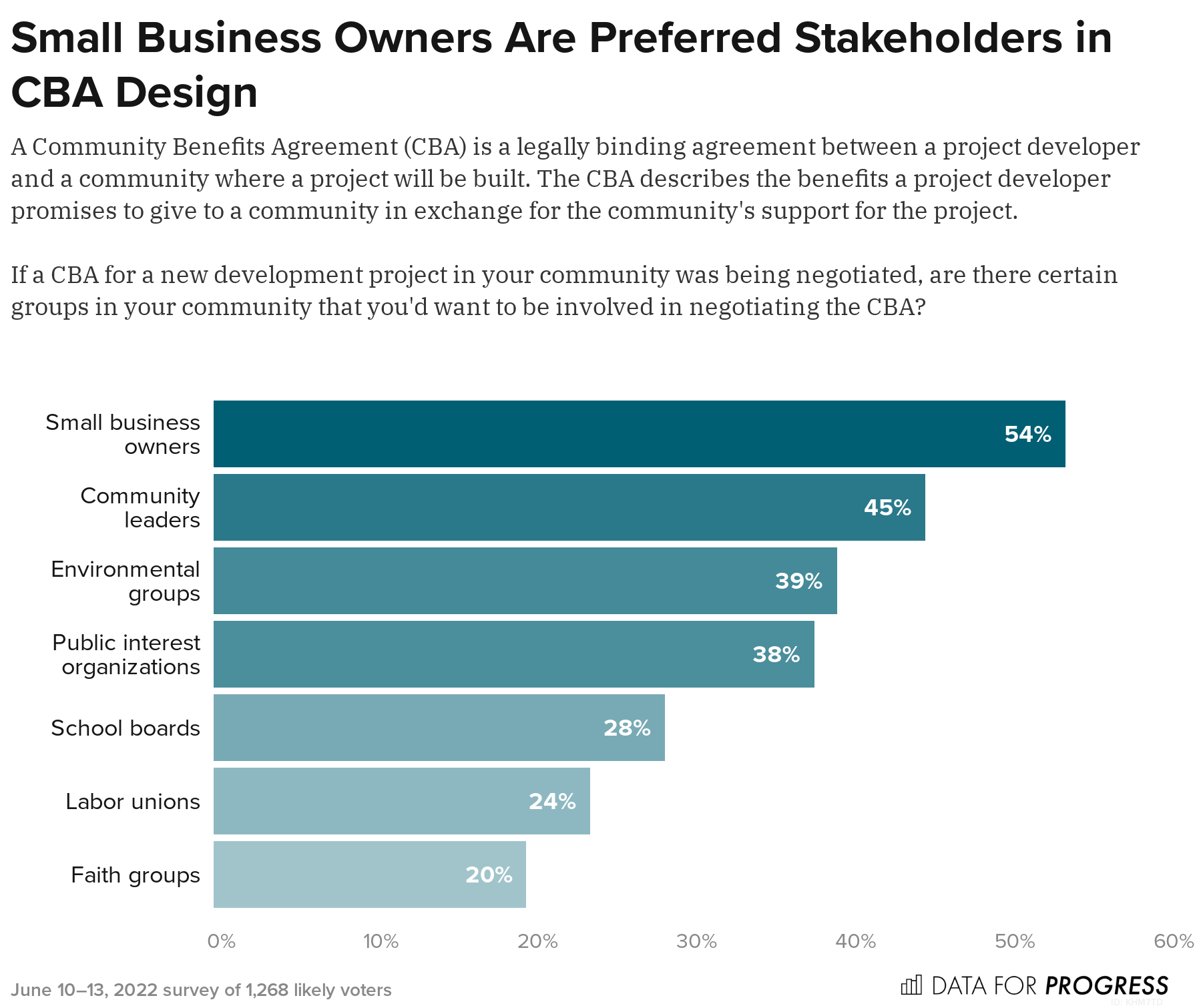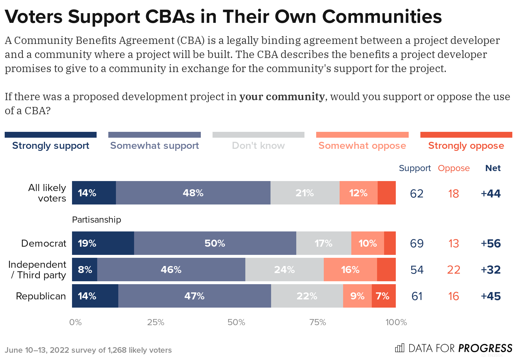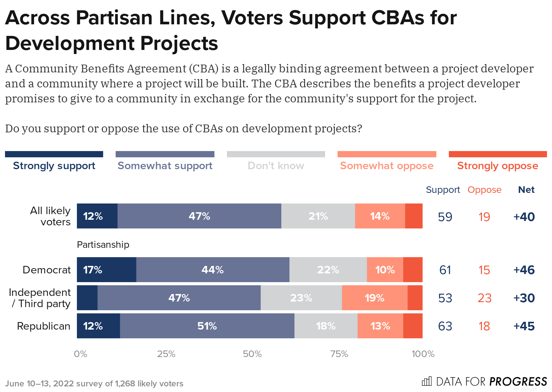 CBAs are overwhelmingly popular. A recent Data for Progress poll finds that 59 percent of likely voters support the use of CBAs on development projects (a +40-point margin of support). And support for CBAs holds across partisan lines, with 61 percent of Democrats, 53 percent of Independents, and 63 percent of Republicans in favor.