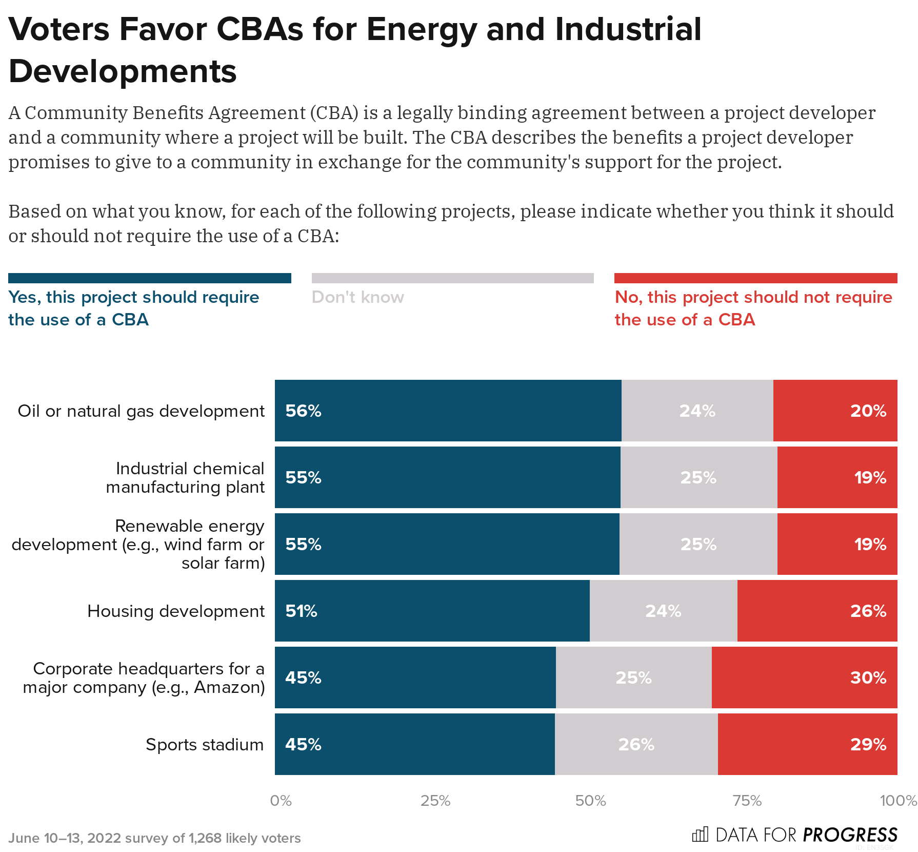 Data for Progress polling finds that likely voters have a vision for CBAs for projects in their community. A majority of likely voters support the use of CBAs on renewable energy developments (55 percent), industrial chemical manufacturing plants (55 percent), and oil and natural gas developments (56 percent).