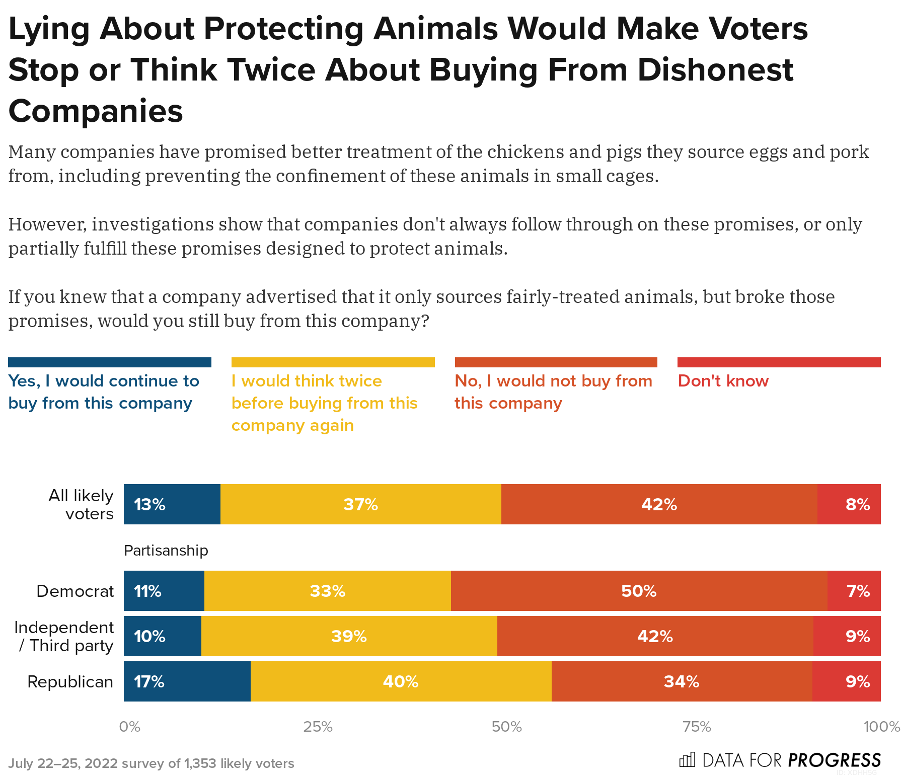 Despite these commitments, however, some companies are not fulfilling these promises. A lack of transparency allowing consumers to track whether companies are actually protecting livestock from harm and exploitation has led some companies to profit despite their broken promises, misleading consumers into thinking they’re purchasing from producers that are not contributing to undue animal suffering. Voters overwhelmingly agree that companies that advertise that they’re switching to more humane products should be transparent about how they’re fulfilling their pledges. This support persists across party lines, with 84 percent of Democrats, 83 percent of Republicans, and 81 percent of Independents in agreement.