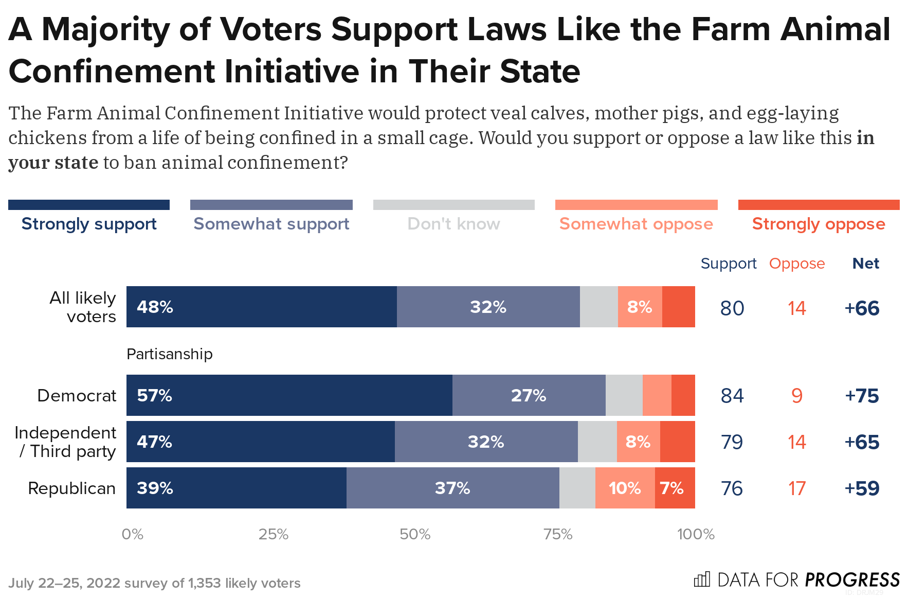 Not only is this law foundational for animal welfare reform, especially in a changing climate where extreme weather makes mass-raising livestock in close quarters more challenging, but Prop 12 is also extremely popular with likely voters. Across party lines, 80 percent of voters across the country support the Farm Animal Confinement Initiative, including 85 percent of Democrats, 81 percent of Independents, and 76 percent of Republicans.