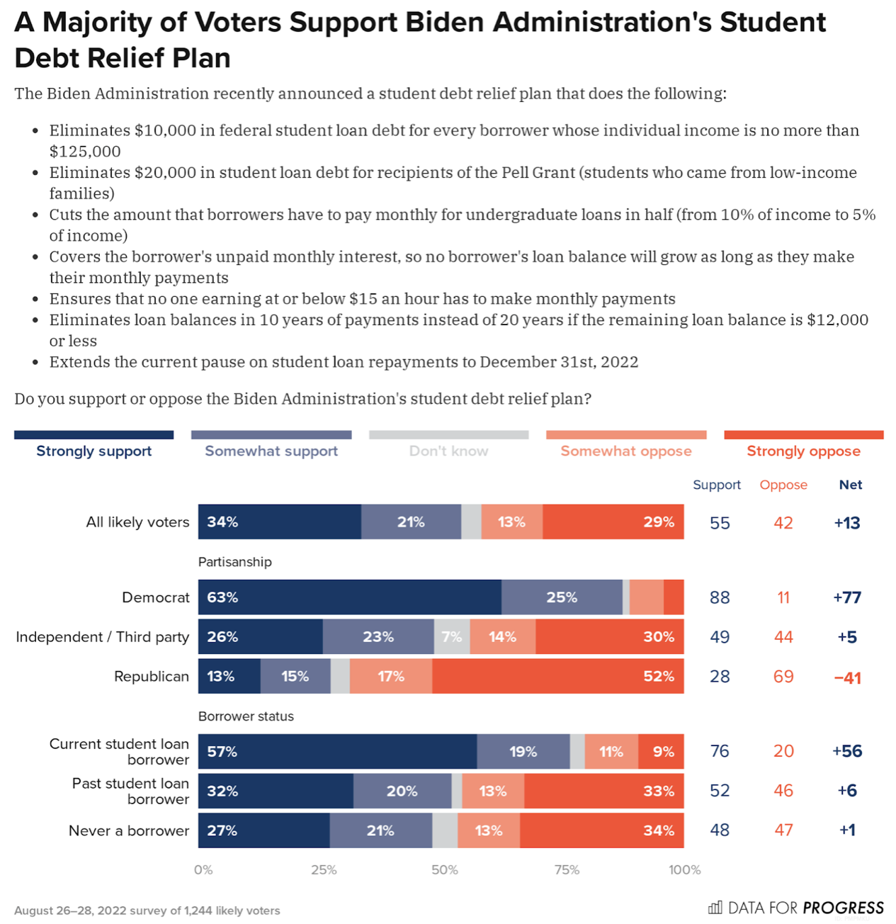 Forgiving $10,000 of debt for borrowers earning no more than $125,000 by a +13-point margin.