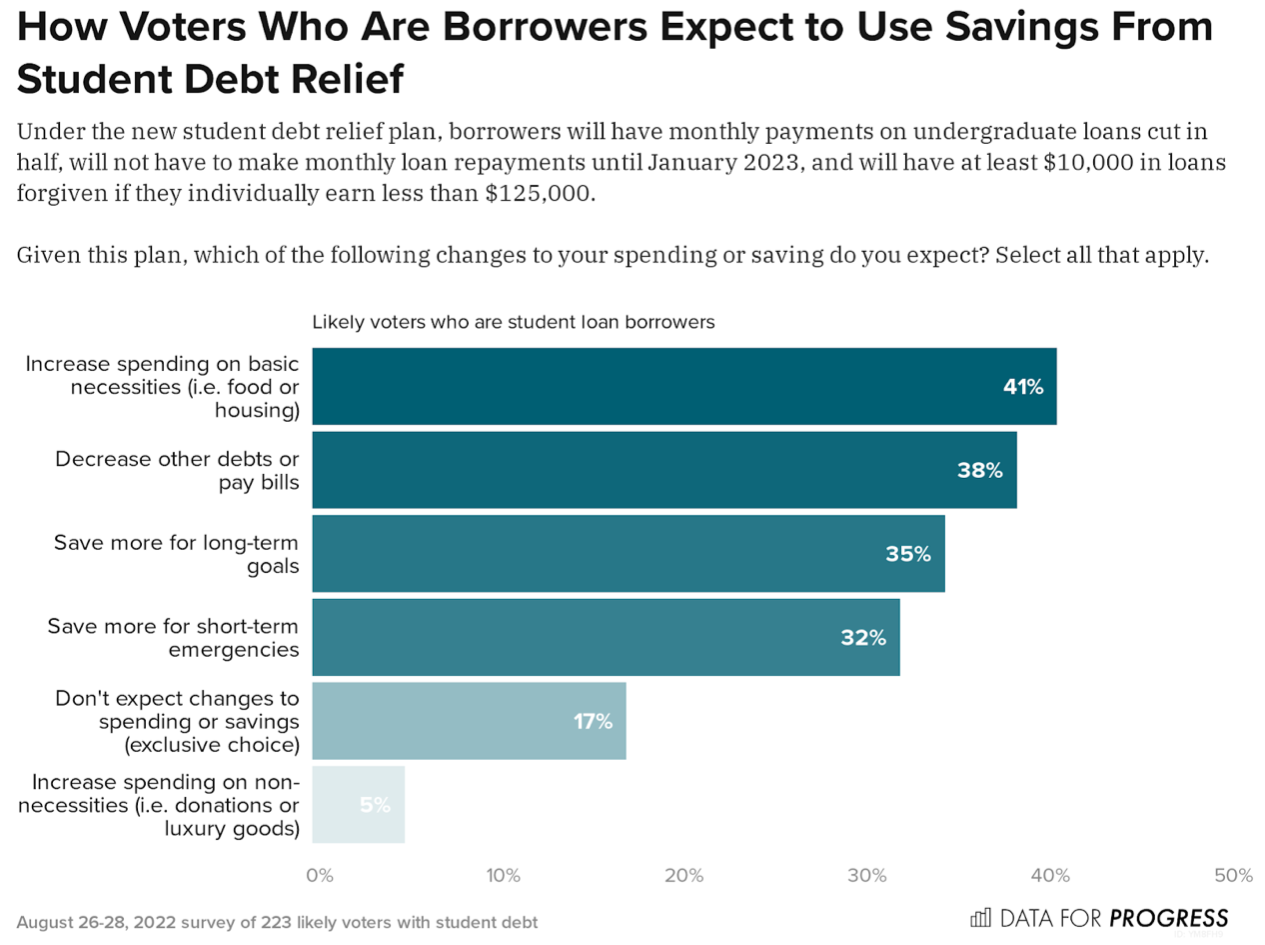 We find that while 41 percent of voters who are student borrowers respond that they would increase their spending on basic necessities, such as food, housing, and healthcare, a mere 5 percent say they would make more discretionary purchases of luxury goods or donations. This suggests that any increases in consumption are unlikely to strain durable goods supply chains. That increased spending on basic necessities is expected to represent the largest change to consumer expenditures indicates that many student borrowers have previously been making tough sacrifices in order to get by.