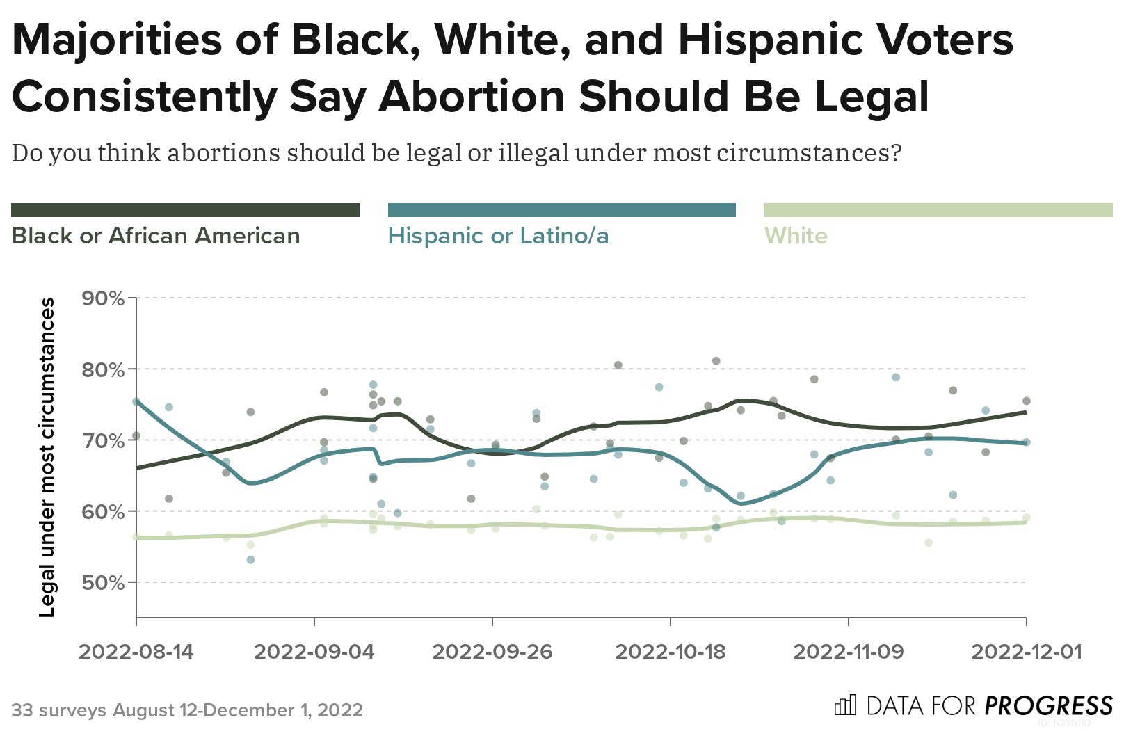 Across the surveys, we find majorities of Black, white, and Hispanic voters consistently on the side of legal abortion as well. On average, 72 percent of Black voters, 67 percent of Hispanic voters, and 58 percent of white voters say abortion should be legal under most circumstances.