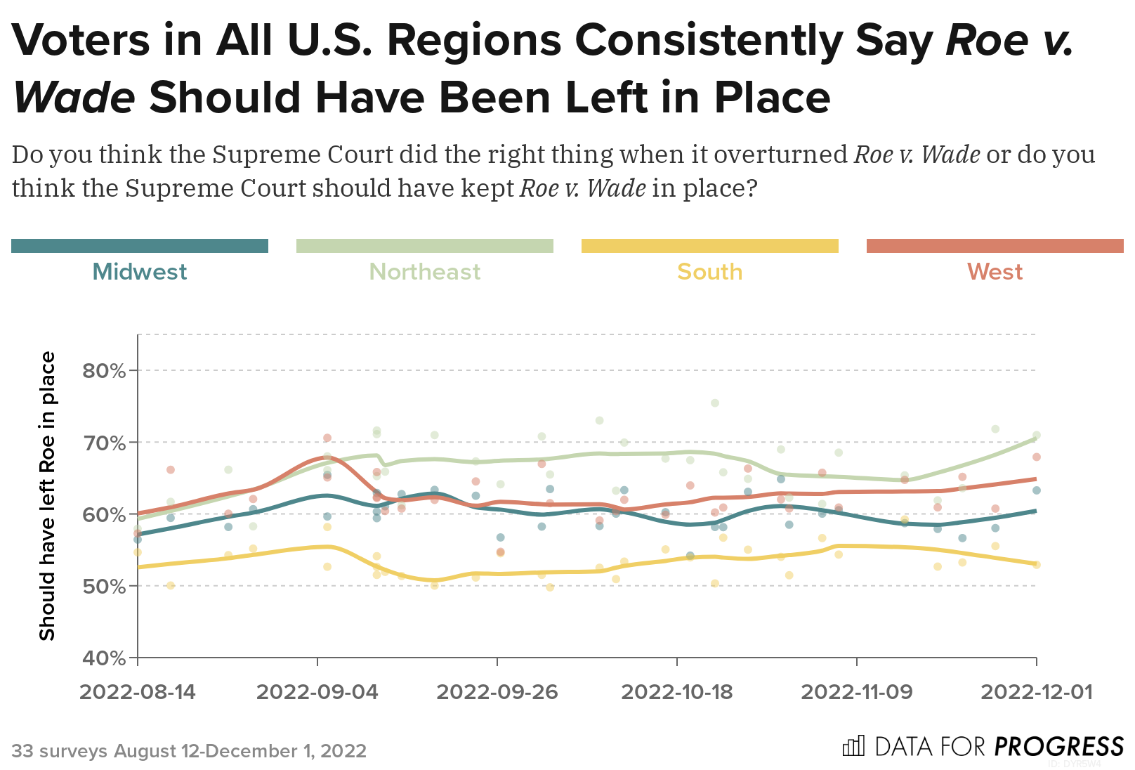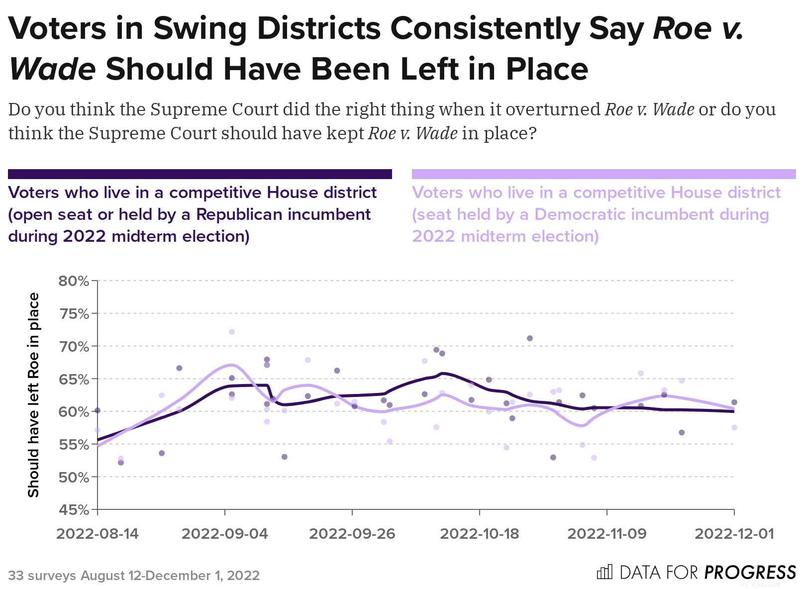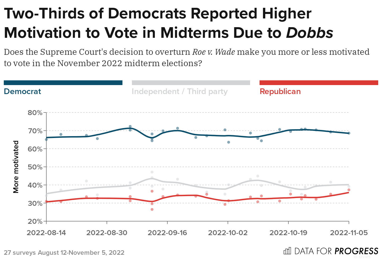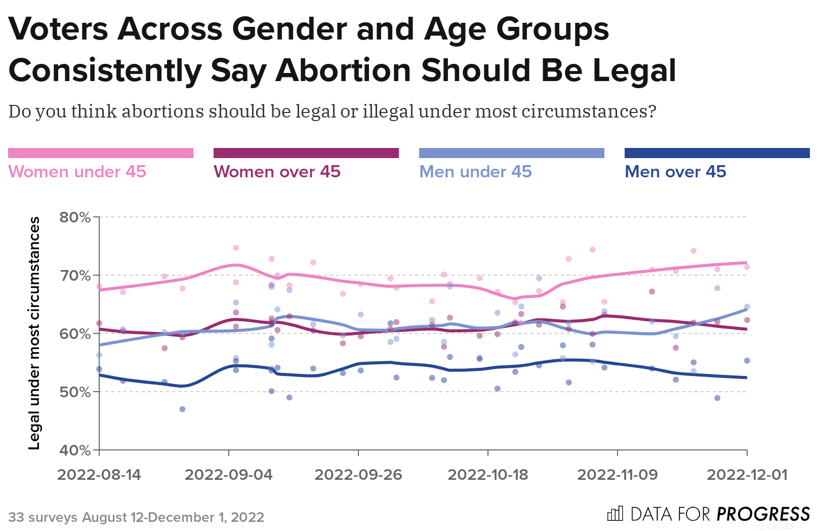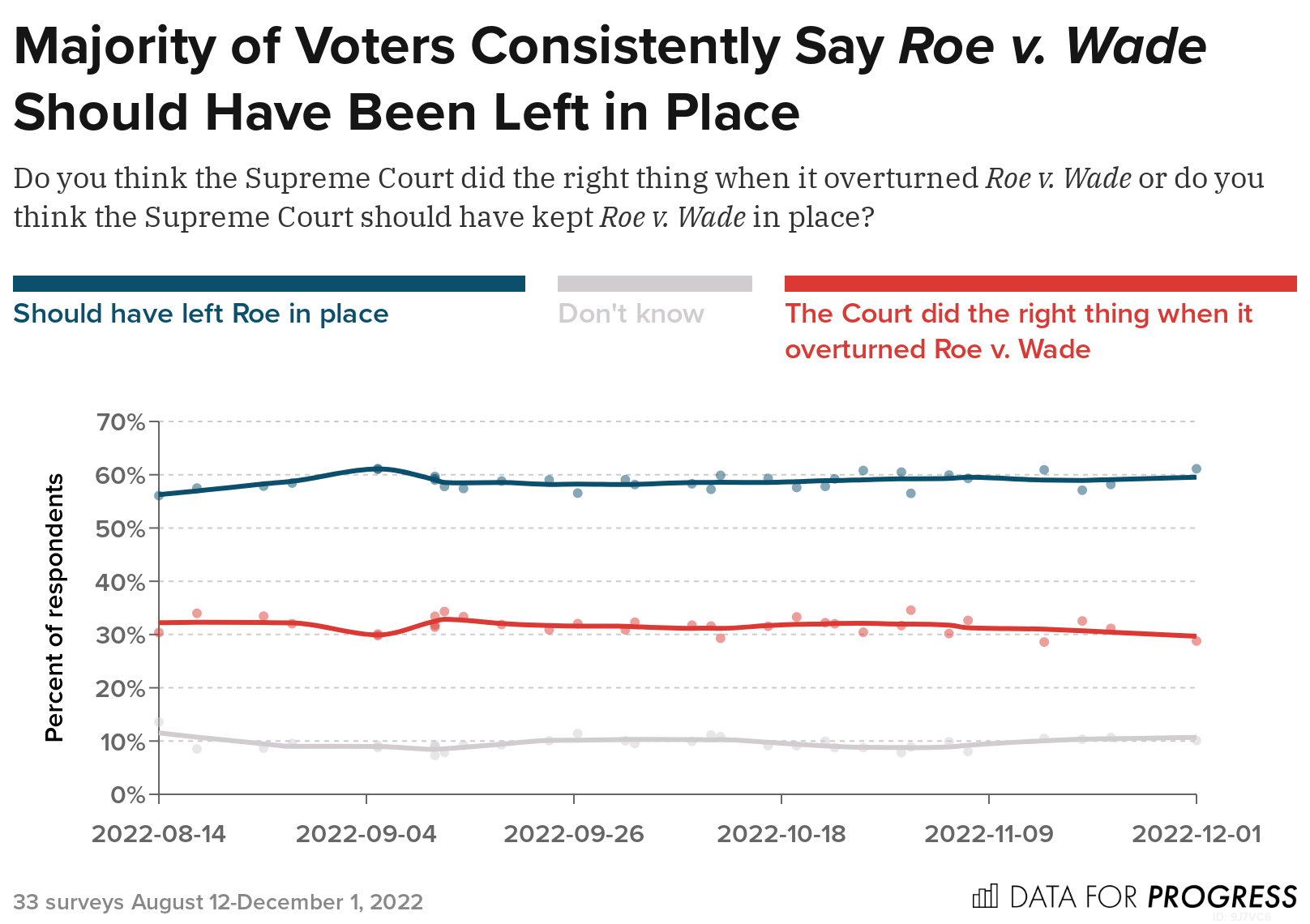 On June 24, 2022, the Supreme Court’s Dobbs v. Jackson Women’s Health Organization decision overturned Roe v. Wade, ending five decades of constitutional protections around abortion in the United States. From August 12 to December 1st, 2022 Data for Progress conducted 33 surveys of a total of 44,383 likely voters. We find, across each of these 33 surveys, a majority of voters say abortion should be legal and that the Supreme Court should have left Roe v. Wade in place. We also find that majorities of Democrats and voters in Republican-held swing districts were more motivated to vote in the 2022 midterm elections due to the Dobbs decision.