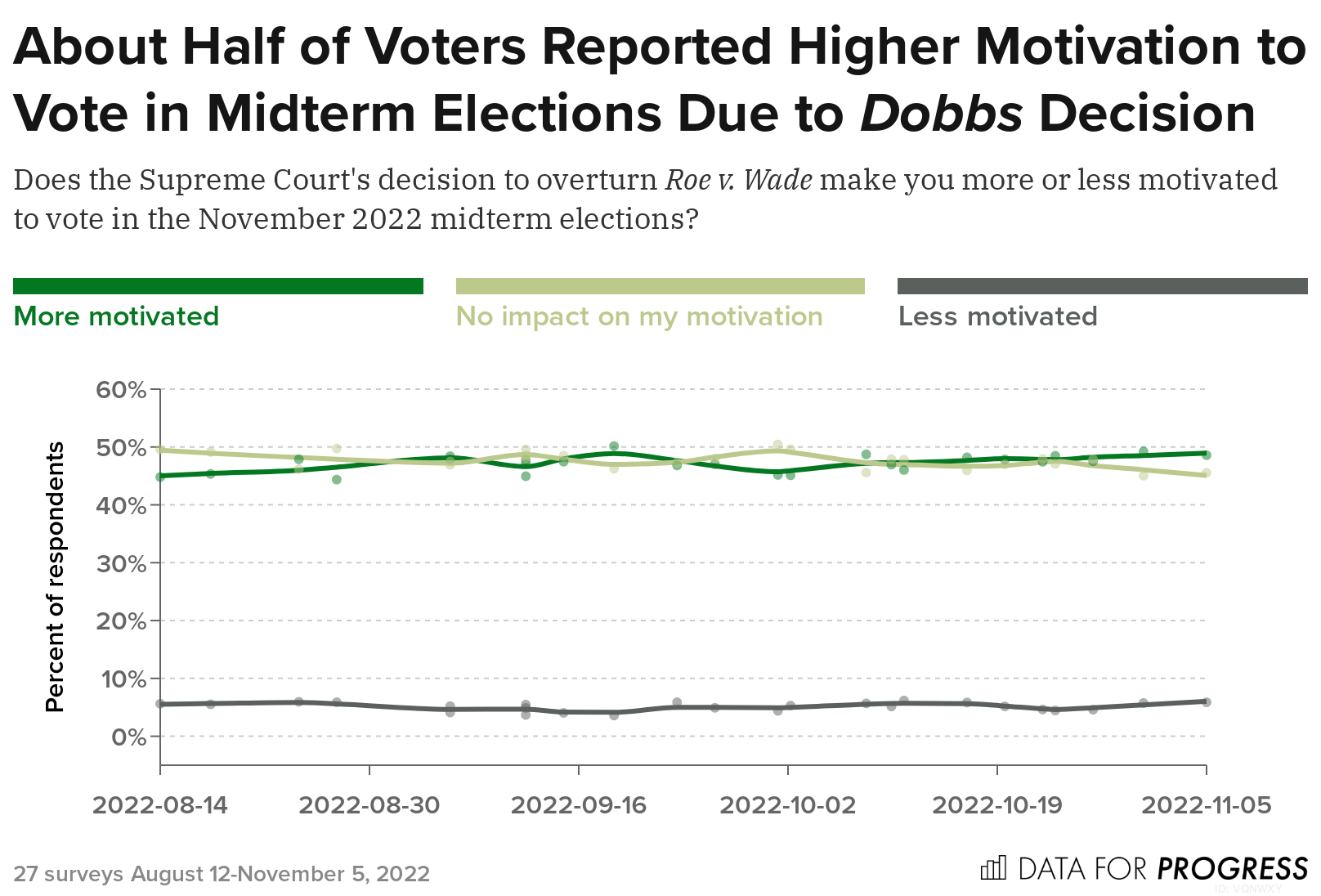 In the 27 surveys conducted before the 2022 midterm elections, we asked voters whether the Supreme Court’s Dobbs decision to overturn Roe made them more or less motivated to vote in the midterms, or if the overturning had no impact on their motivation. On average, across the 27 surveys, 47 percent of voters reported feeling more motivated and 48 percent reported no impact on their motivation to vote in November due to Dobbs.