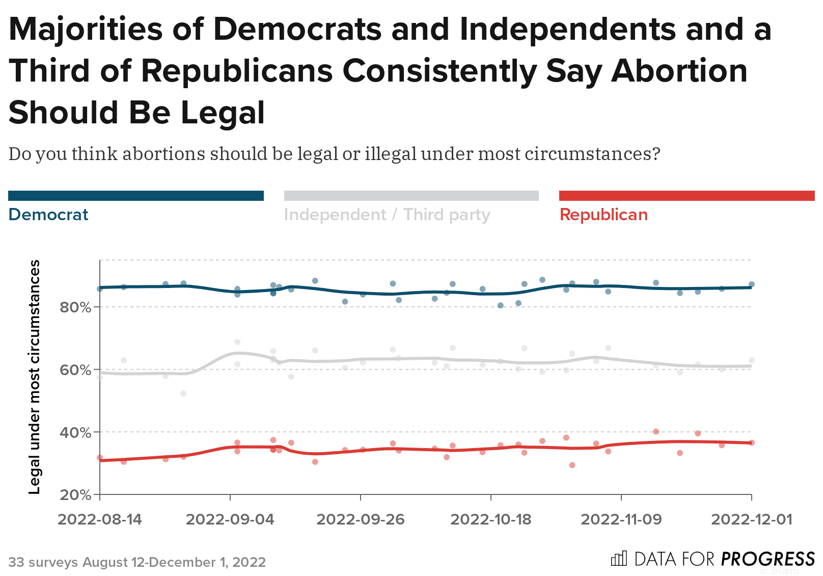 On average, across the 33 surveys, 86 percent of Democrats, 62 percent of Independents, and 34 percent of Republicans say they think abortion should be legal. From August to December, Republican support for legal abortion has gradually increased by about 8 percentage points.