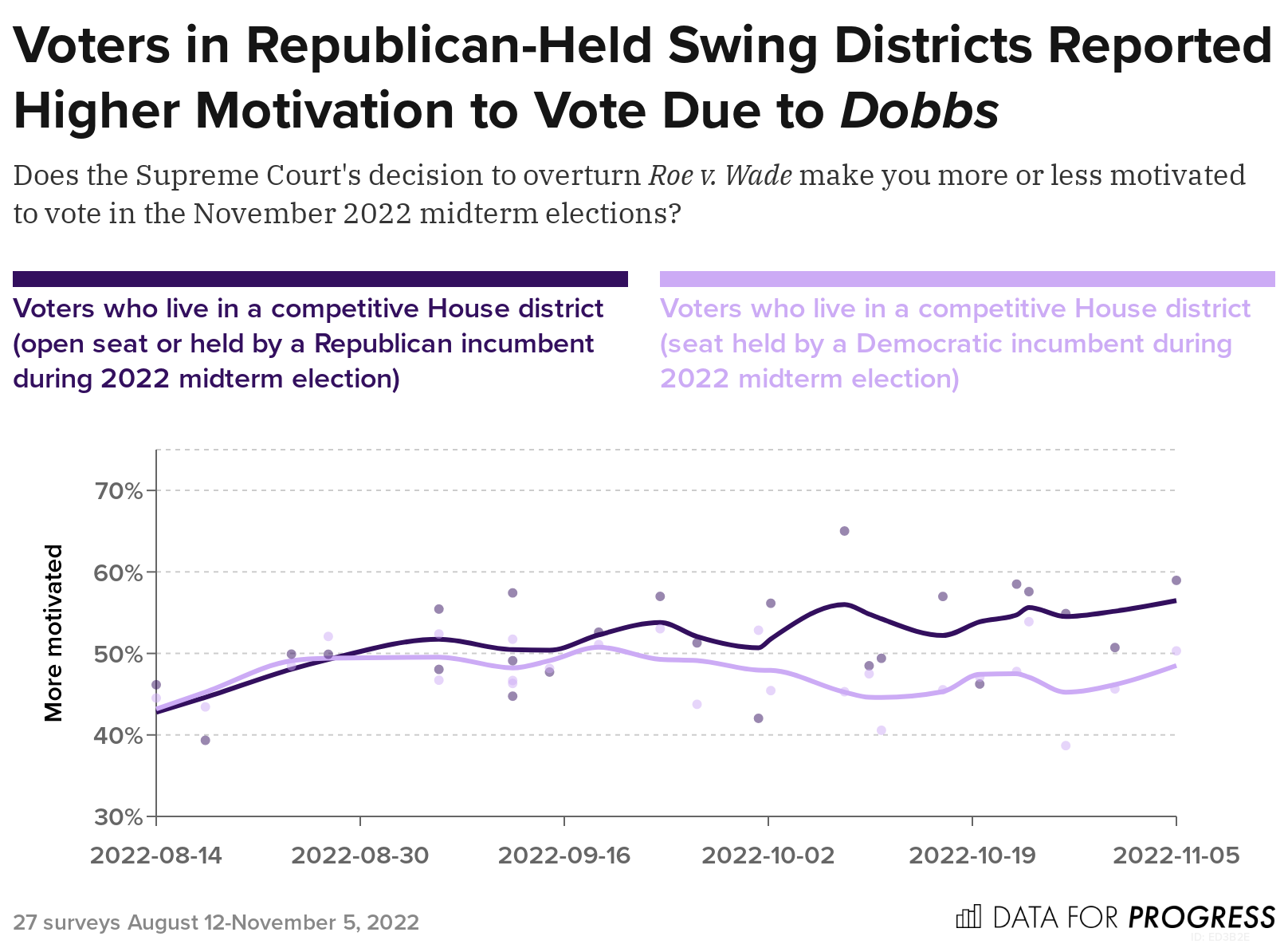We again looked at these survey results by voters who live in swing districts. On average, across the 27 surveys leading up to the midterms, 52 percent of voters in Republican-held swing districts reported that they were more motivated to vote due to Dobbs, compared to 47 percent of voters in Democrat-held swing districts who said the same. Voters in Democrat-held and Republican-held swing districts around mid-August reported similar levels of motivation to vote due to the overturning of Roe. However, by mid-October, these motivation levels notably diverged, and voters in swing districts held by Republican incumbents reported significantly higher motivation to vote in the midterms due to the Dobbs decision, compared to voters in swing districts held by Democratic incumbents. By the final survey there was a 9 percent difference in motivation levels between the two groups.