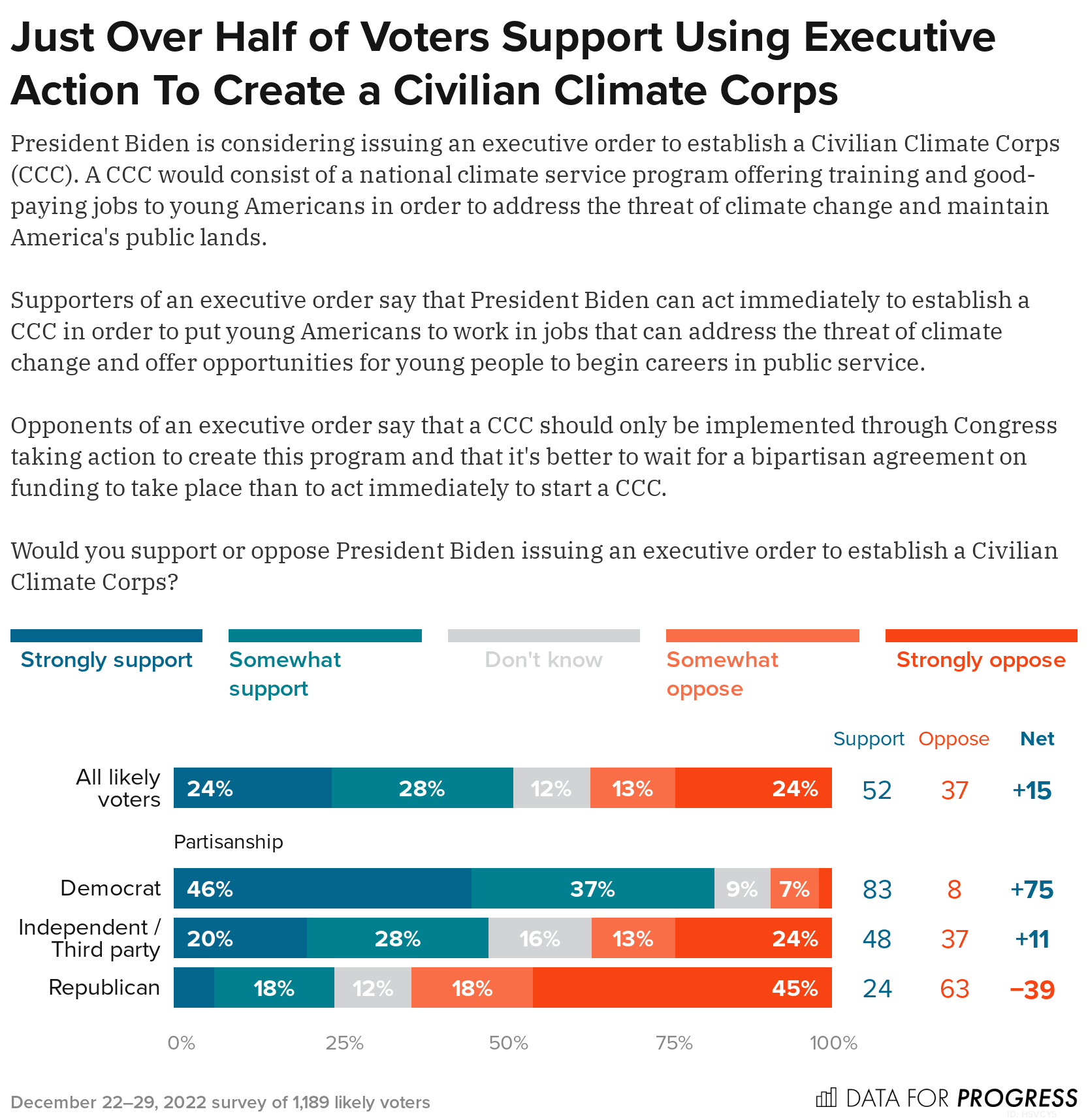 Data for Progress finds that a majority of likely voters (52 percent) support Biden using an executive order to establish a CCC after hearing arguments for and against the strategy. Additionally, 83 percent of Democrats and 48 percent of Independents back the establishment of a CCC via executive order, reflecting little reduction of support among Biden’s key constituencies.