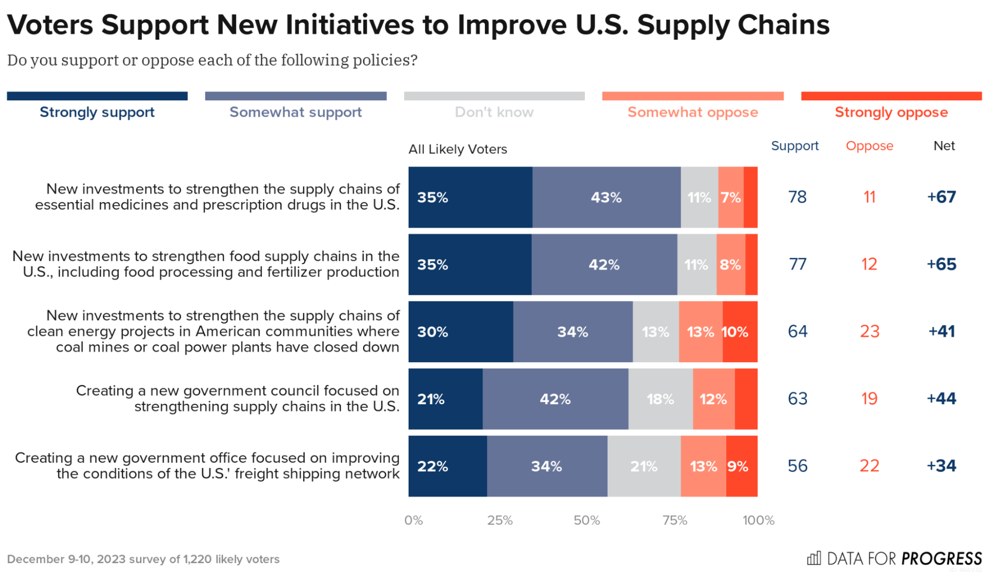 According to the Federal Reserve Bank of San Francisco, more than half of the surge of inflation in 2021 and 2022 was caused by supply chain pressures. In this survey, Data for Progress tested support for new targeted investments from the Biden administration to improve the efficiency and resilience of American supply chains.