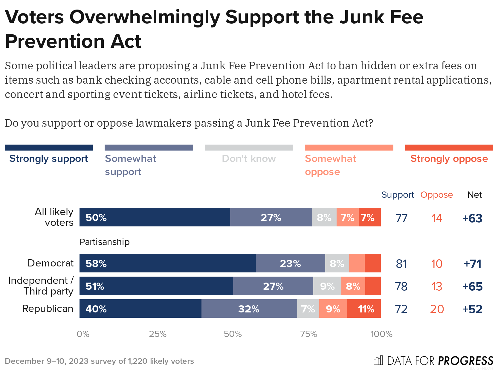 We also tested support for the Junk Fee Prevention Act, which would ban hidden or extra fees on items like cable and cell phone bills, apartment rental applications, and concert and sporting event tickets. We find that the proposal is overwhelmingly popular, with support from 77% of voters — including 81% of Democrats, 78% of Independents, and 72% of Republicans.