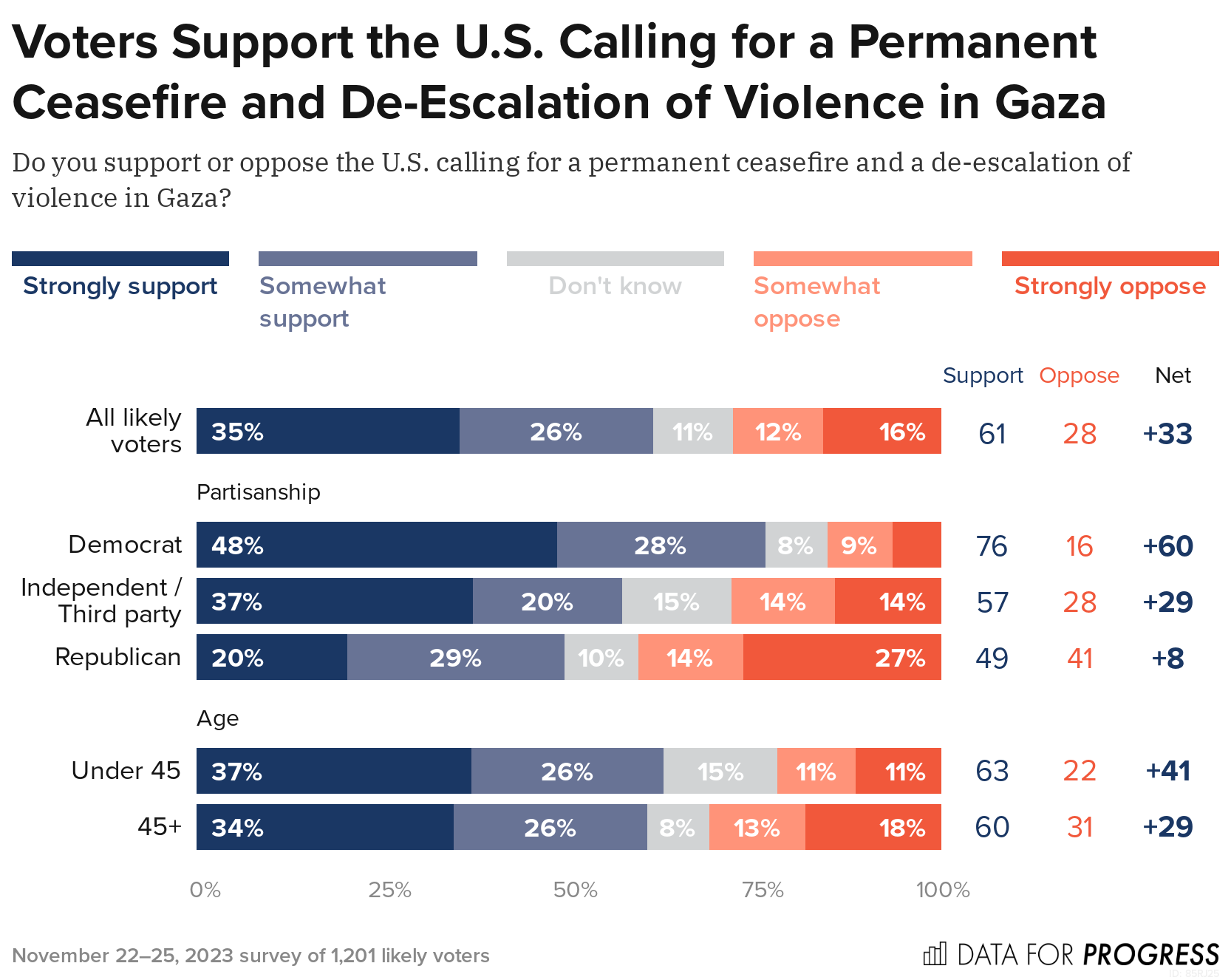Sixty-one percent of likely voters, including a majority of Democrats (76%) and Independents (57%) and a plurality of Republicans (49%), support the U.S. calling for a permanent ceasefire and a de-escalation of violence in Gaza.