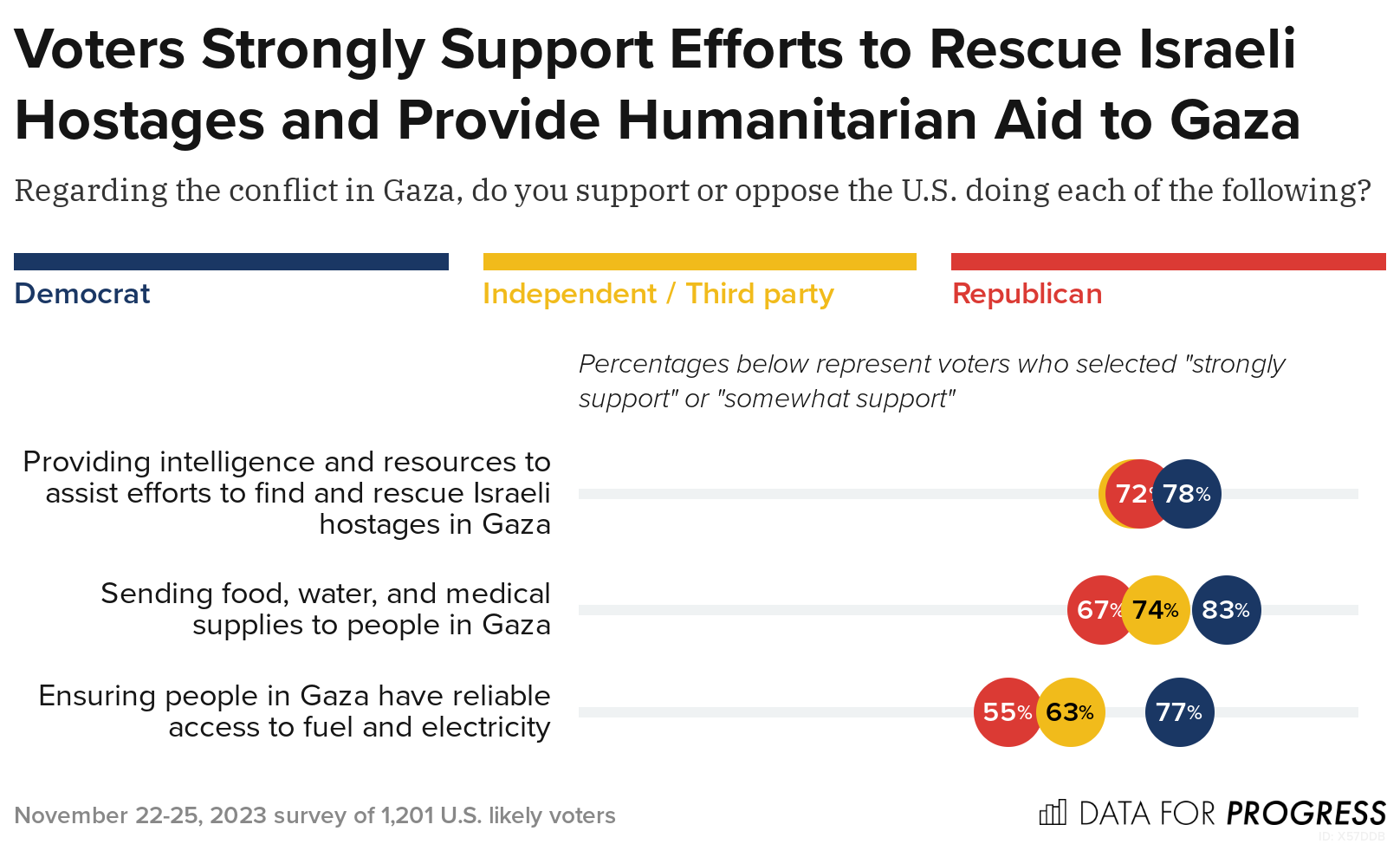 When asked about additional courses of action regarding U.S. involvement in the conflict in Gaza, more than 2 in 3 voters across party lines support the U.S. “providing intelligence and resources to assist efforts to find and rescue Israeli hostages in Gaza” and “sending food, water, and medical supplies to people in Gaza.” A majority of voters across party lines also support “ensuring people in Gaza have reliable access to fuel and electricity” (65%).
