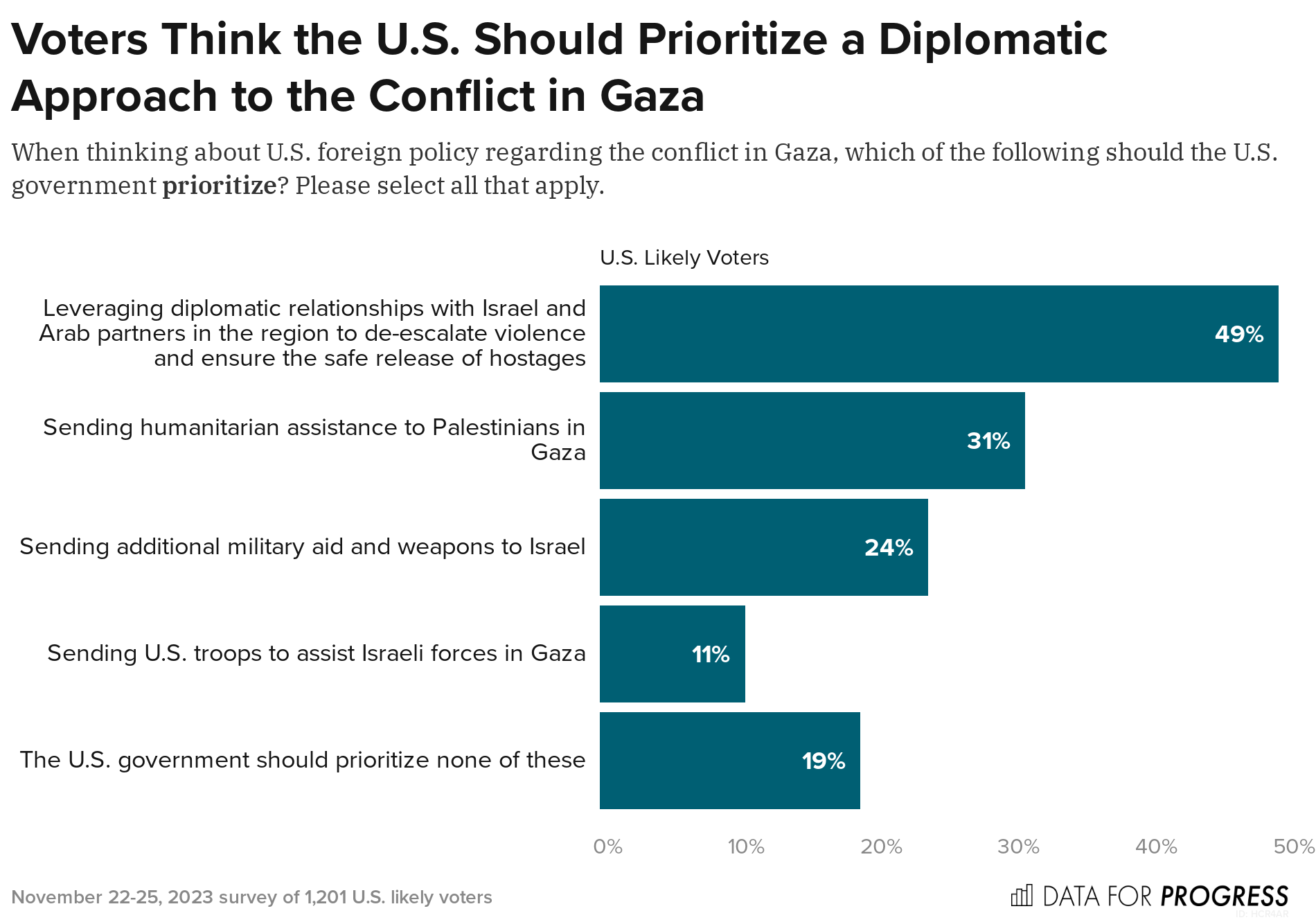 From November 20 to 21, 2023, Data for Progress conducted a survey of 1,203 U.S. likely voters nationally using web panel respondents. The sample was weighted to be representative of likely voters by age, gender, education, race, geography, and voting history. The survey was conducted in English. The margin of error is ±3 percentage points.
