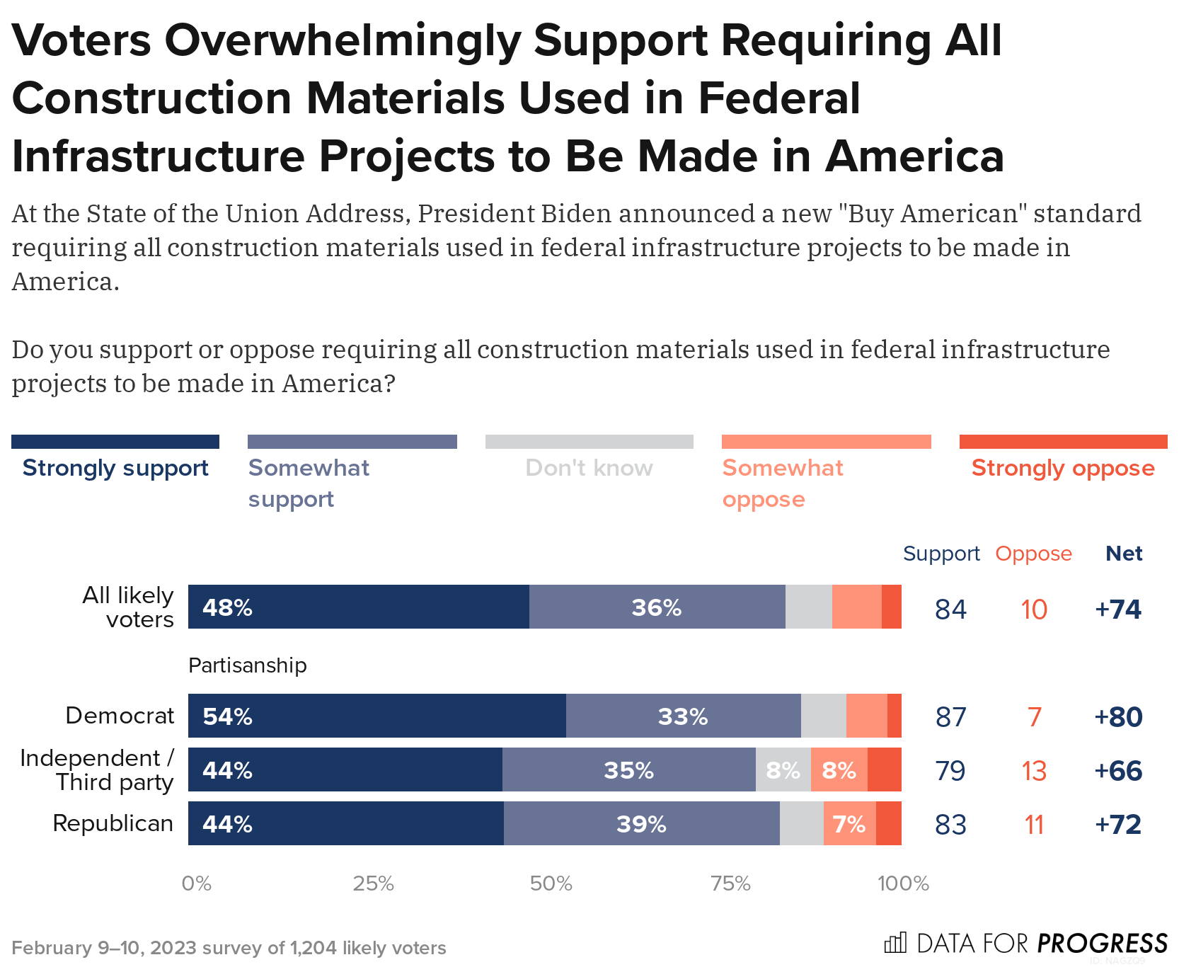 As major investments from the Inflation Reduction Act and the Infrastructure Investment and Jobs Act begin to be rolled out for infrastructure projects at the federal, state, and local levels, Biden announced new guidance to ensure construction materials used in these infrastructure projects will be American-made. We find voters are widely supportive of this announcement, with 84 percent of voters in support of requiring all construction materials used in federally funded infrastructure projects to be made in America. Eighty-seven percent of Democrats, 79 percent of Independents, and 83 percent of Republicans support this proposal, demonstrating strong consensus across party lines.