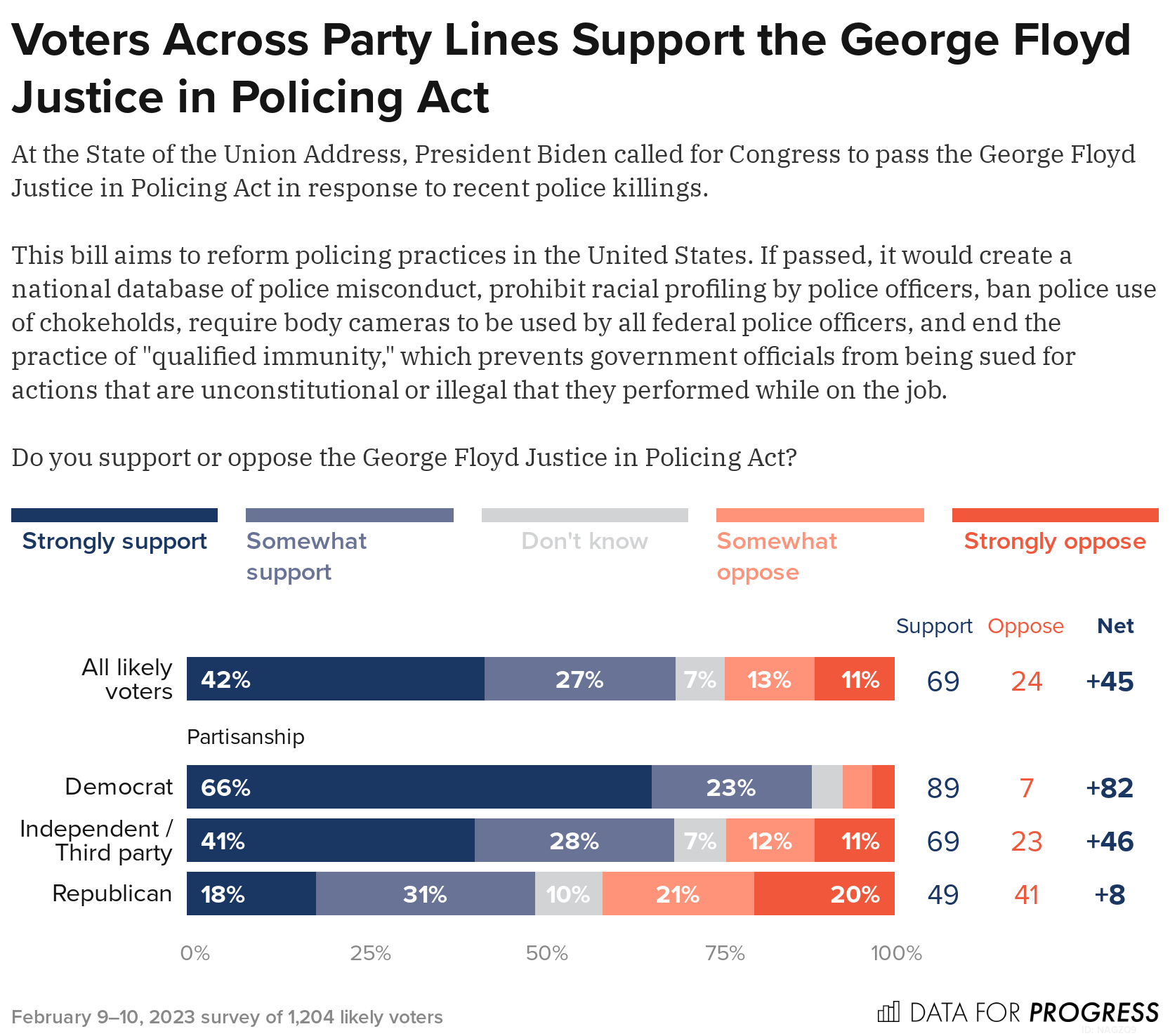 With the recent high-profile police killing of Tyre Nichols in Memphis, Tennessee, voters also want to see action on police reform. In line with previous Data for Progress polling, we find the George Floyd Justice in Policing Act enjoys the support of a strong majority of voters (69 percent), including an overwhelming majority of Democrats (89 percent), 69 percent of Independents, and a plurality of Republican voters (49 percent).