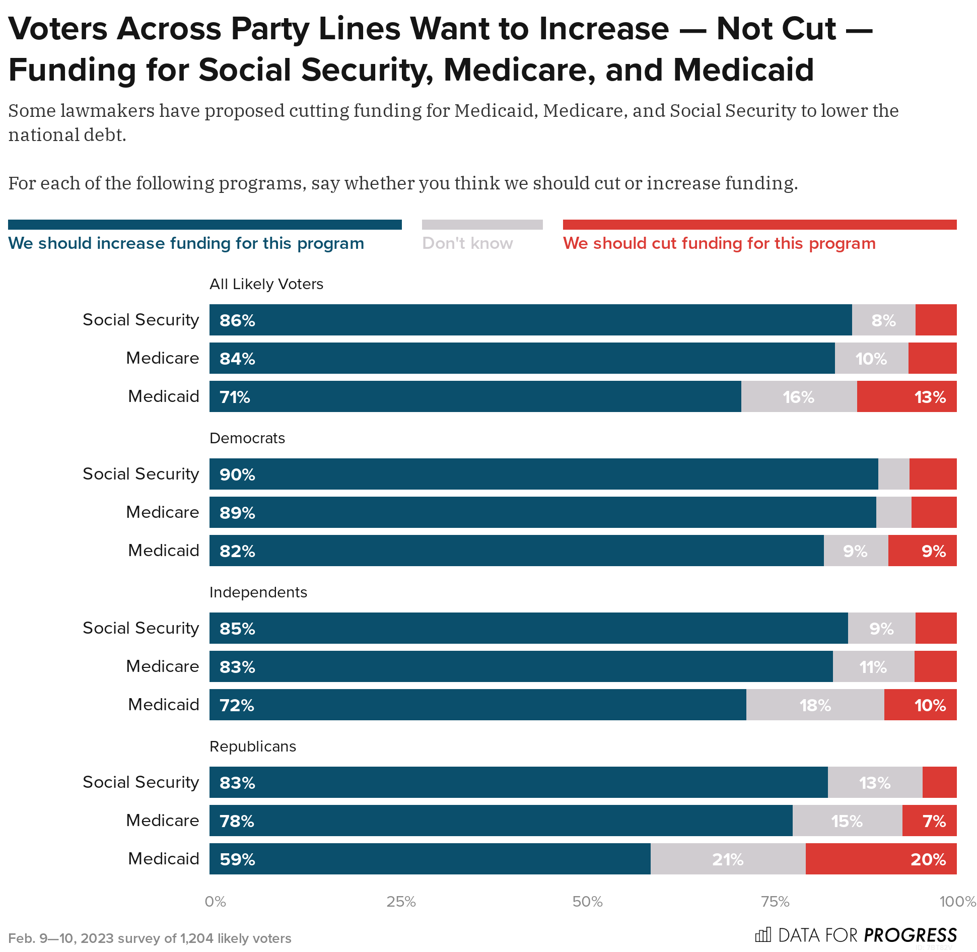 During his speech, Biden directed special attention toward the actions of certain Republican lawmakers who have proposed cutting funding for programs like Social Security and Medicare to address the national deficit. Data for Progress finds that voters reject this proposal: Voters overwhelmingly agree that we should increase funding for Social Security, Medicare, and Medicaid at 86 percent, 84 percent, and 71 percent, respectively.