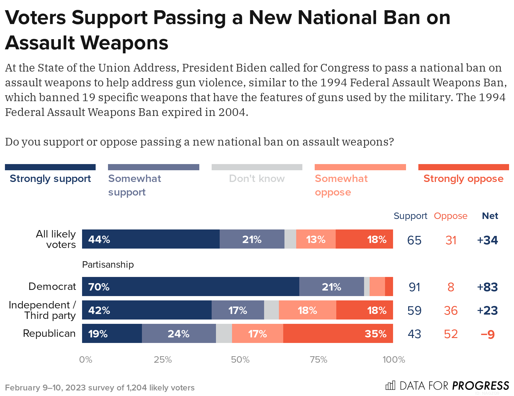 Data for Progress finds a majority of voters (65 percent) support a new ban on assault weapons, including 91 percent of Democrats, 59 percent of Independents, and 43 percent of Republicans.