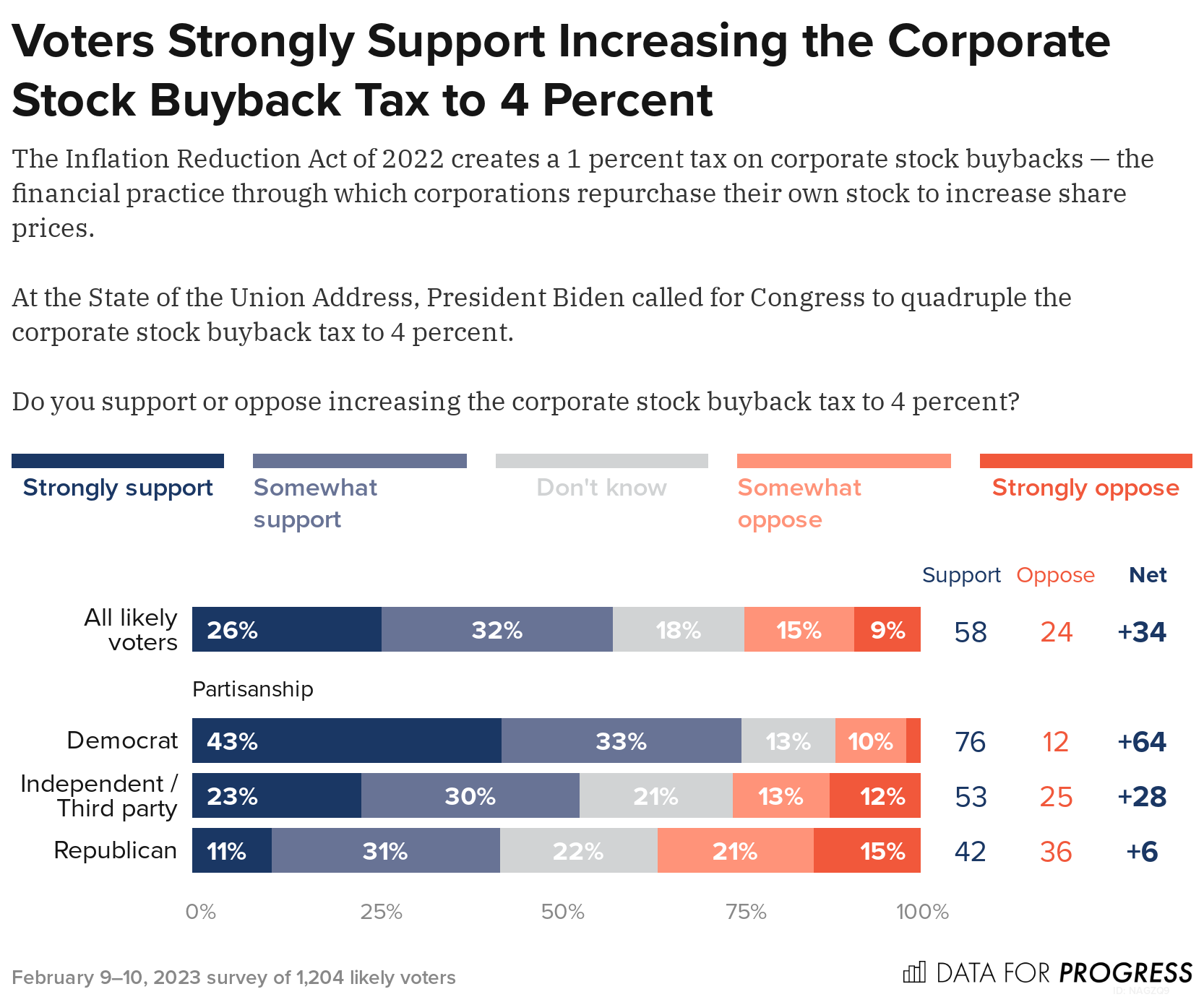 The Inflation Reduction Act introduced a 1 percent tax on corporate stock buybacks. During the State of the Union, Biden urged Congress to increase this tax to 4 percent. Data for Progress finds 58 percent of voters support this proposal, including 76 percent of Democrats, 53 percent of Independents, and 42 percent of Republicans.