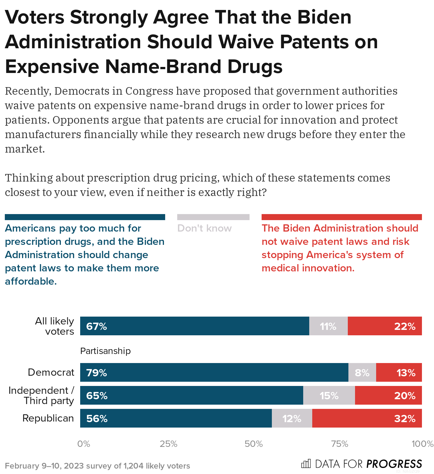 Voters are also supportive of continued action by Biden and Democrats in Congress to lower the price of prescription drugs for patients, such as waiving patents on expensive name-brand drugs. Even when presented with common arguments from opponents — that patents are needed for innovation and to protect manufacturers while they research new drugs — Data for Progress polling finds 67 percent of voters believe that Americans are paying too much for prescription drugs and that Biden should move forward with changing patent laws to make them more affordable. This holds strong bipartisan support, with 79 percent of Democrats, 65 percent of Independents, and 56 percent of Republicans in agreement.