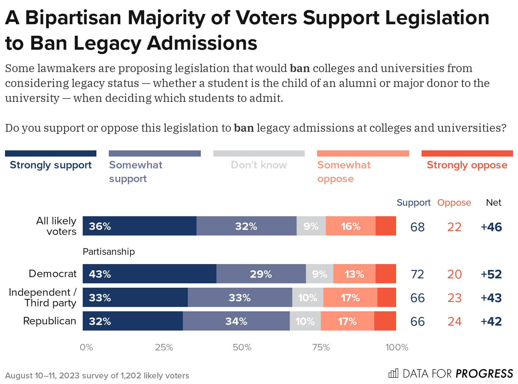 We find that 68% of voters support legislation to ban legacy admissions, including 72% of Democrats and 66% of both Republicans and Independents.