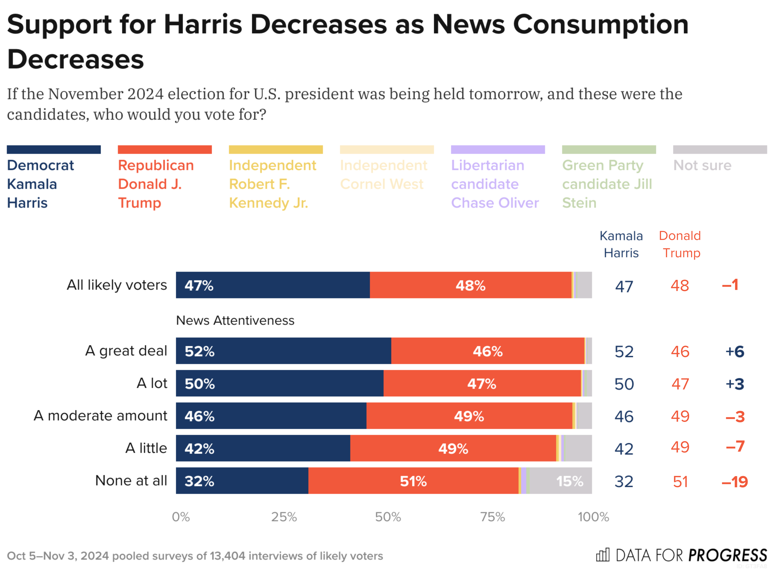 For us, one factor was difficult to ignore: how closely voters paid attention to political news. We asked respondents how much they follow national politics across TV, radio, newspapers, and the internet, with responses from “a great deal” to “none at all.” After we pooled a month’s worth of respondents before the election, here’s who each group favored: