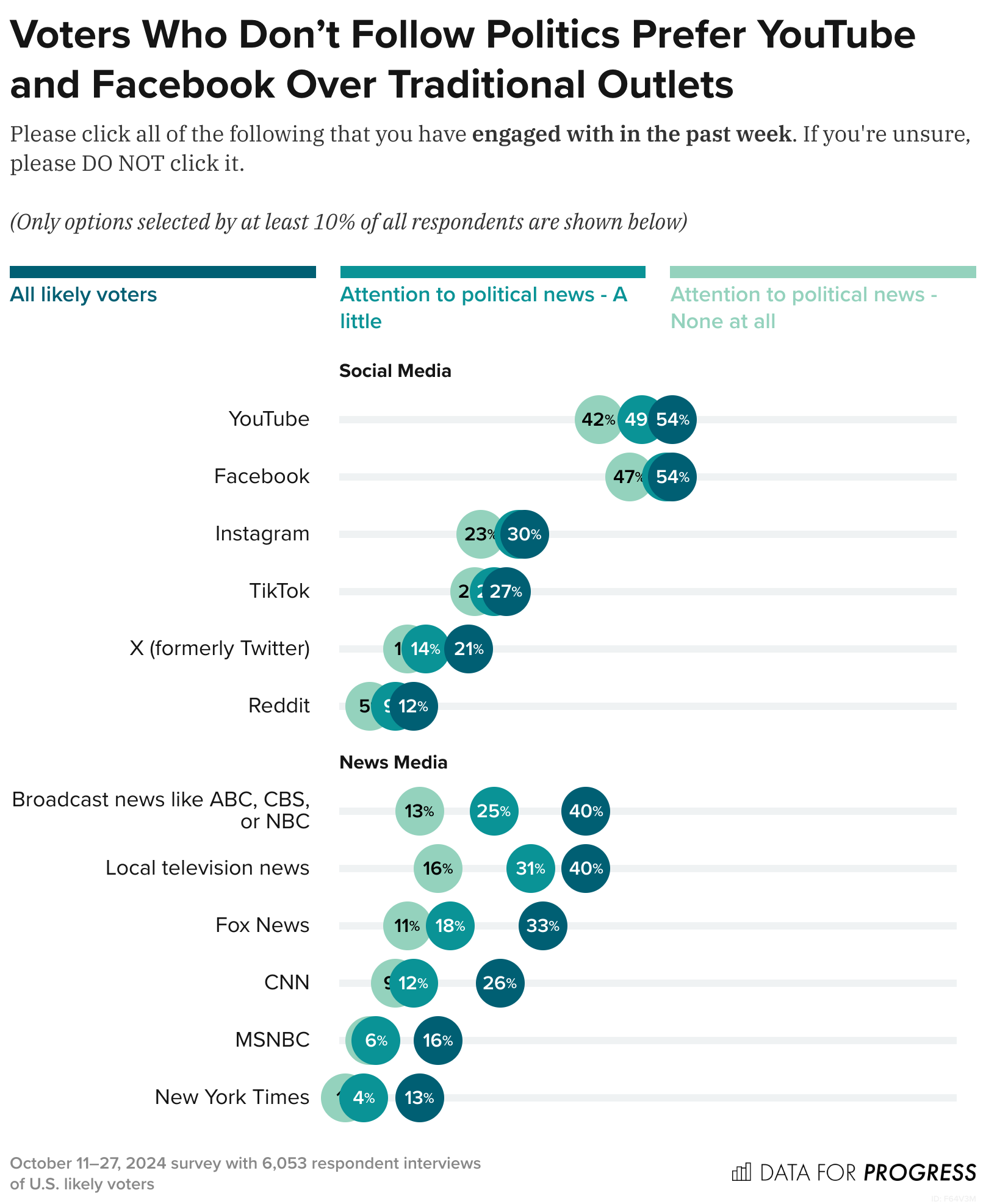 In a separate pooled survey from October 11-27, we find that the least engaged voters — those who say “none at all” or “a little” when we ask them how much attention they pay to politics — are spending their time on social media platforms like YouTube and Facebook, not on cable news or The New York Times.